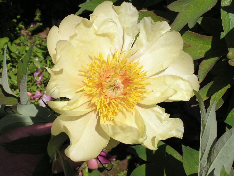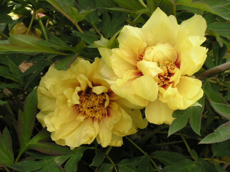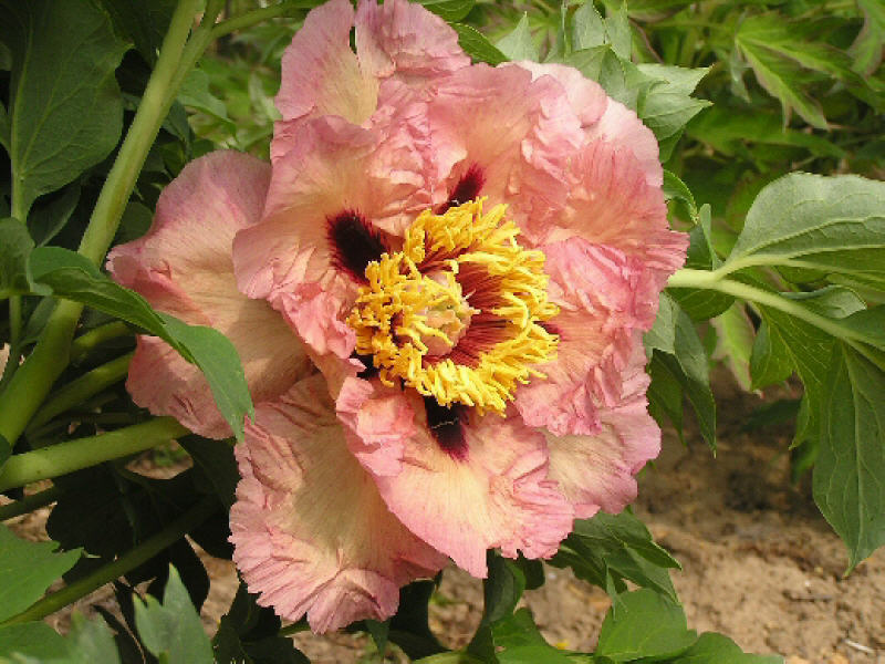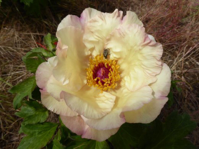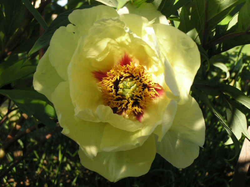 Sortenname: Mine D'Or Blütenfarbe: gelb Wuchshöhe: 1,5 m Blütengröße: 16 cm Original: Frankreich/Lemoine 1943 Blütenform: einfach Wuchsstärke mittel - stark Blütezeit: spät Blütenfarbe: gelb Blütenform: einfach Besonderheit: roter Basalfleck