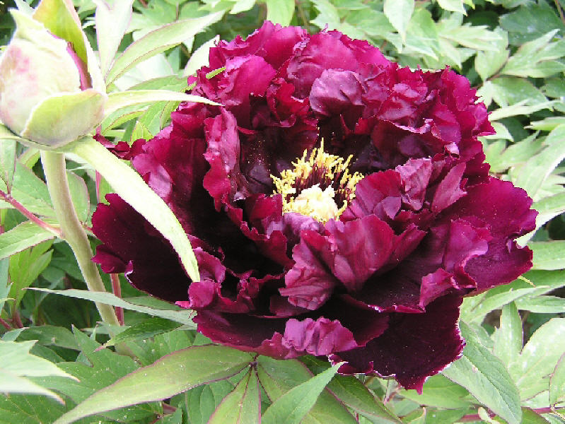Sortenname: Kokamon Blütenfarbe: schwarz, tief rot Wuchshöhe: 1,5 m Blütengröße: 18 cm Original: Japan Bestell.Nr.: Suf.20970 Blütenform: halbgefüllt Wuchsstärke stark Blütezeit: mitte - spät