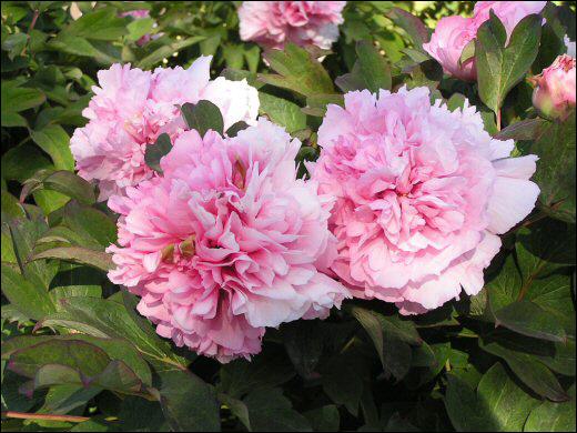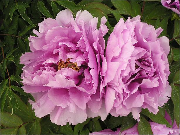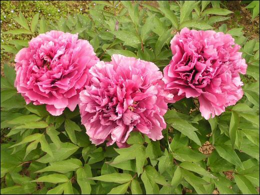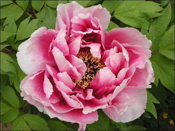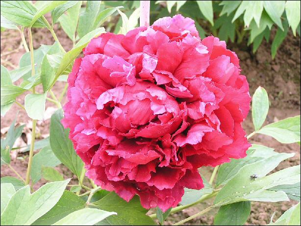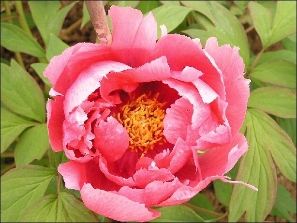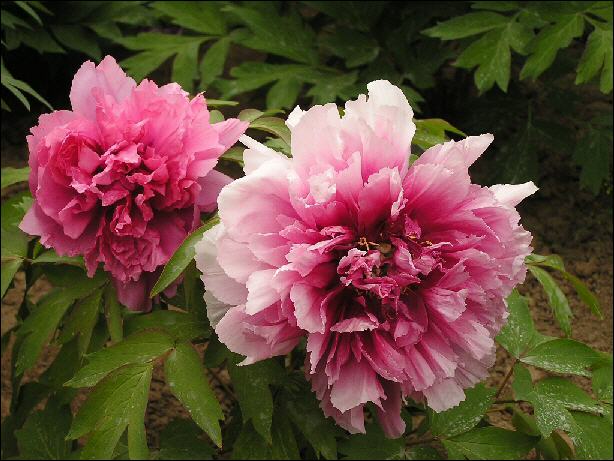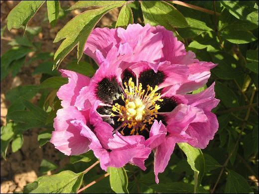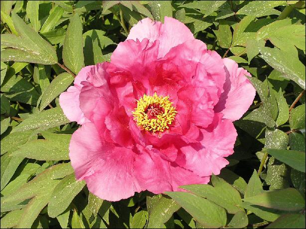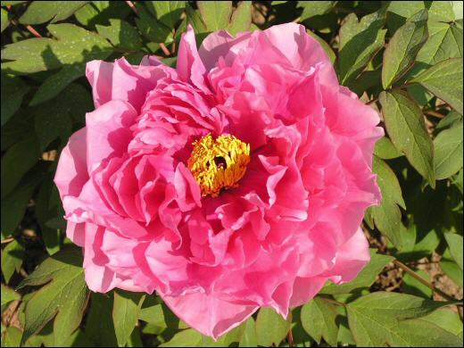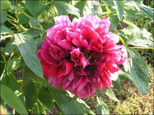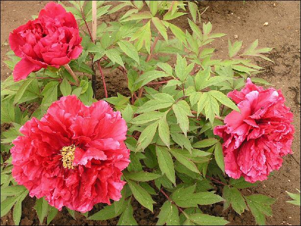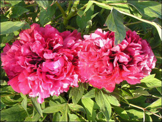 Sortenname: Kui Hua Hong Blütenfarbe: rubin rosa Wuchshöhe: 1,2 - 1,5 m Blütengröße: China Original: 15 cm Bestell.Nr.: Suf.20990 Blütenform: halbgefüllt Wuchsstärke schmal, langsam Blütezeit: mitte - spät Besonderheit: gelb grünes Laub